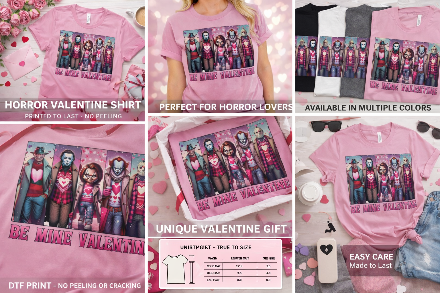 This horror-inspired Valentine design features a lineup of classic slasher-style characters dressed in festive pinks and reds, complete with hearts and a bold “Be Mine Valentine” message.