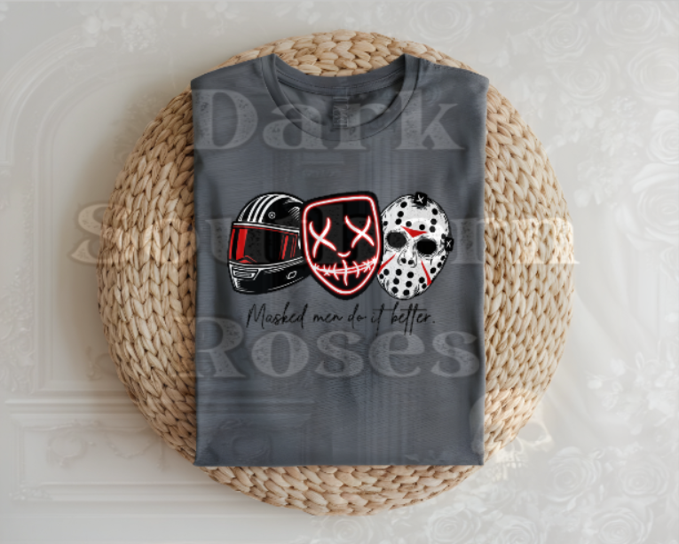 The Masked Men Do It Better tee by Dark Southern Roses blends soft comfort with daring attitude and a horror-inspired edge. Each shirt is professionally pressed using premium DTF printing for a smooth, long-lasting finish that never cracks or peels — no matter how many stories your shirt tells.